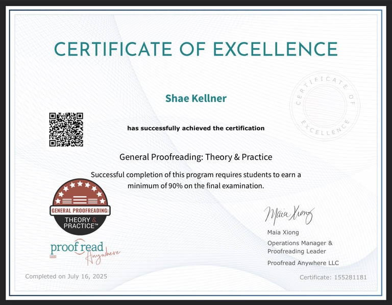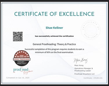 As a certified and extensively trained proofreader, I am dedicated to transforming my clients' writing aspirations into tangible realities. My comprehensive training has equipped me with a keen eye for detail and an unwavering commitment to excellence, ensuring that every piece of writing I review is polished to perfection. I understand the significance of clear and impactful communication, and I leverage my expertise to enhance the credibility and effectiveness of your work. With my skills at your disposal, you can rest assured that your writing will not only meet but exceed your expectations, allowing your voice to shine through with clarity and confidence.